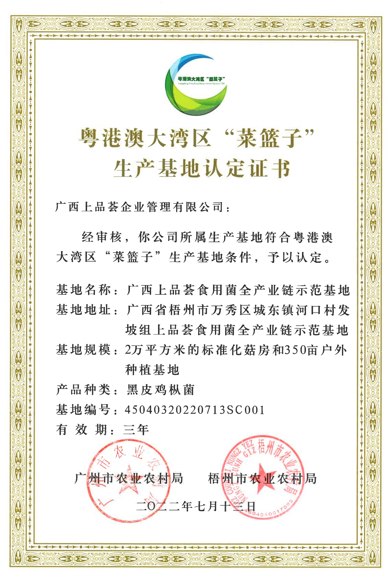 • 粵港澳區“菜籃子”生產基地認定證書
